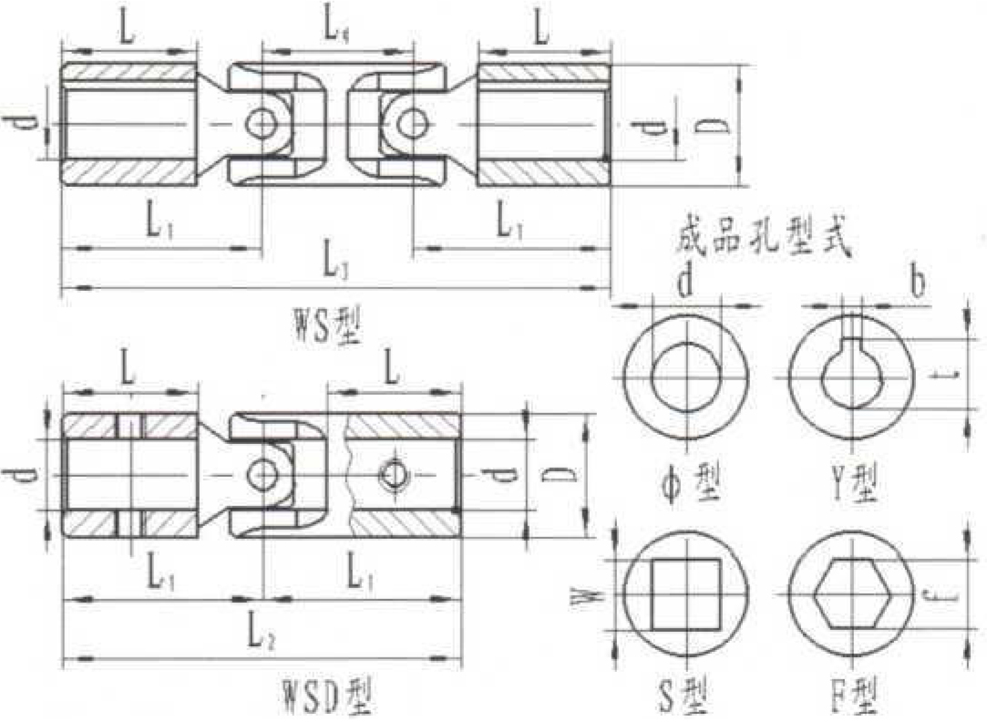 B.轴孔型式:0)一光圆柱孔,带锥销孔:Y带键圆柱孔,带紧钉。轴孔及键型与尺寸符合GB/T 3852-1997规定。S-四方形孔,带紧钉; F六角型孔,